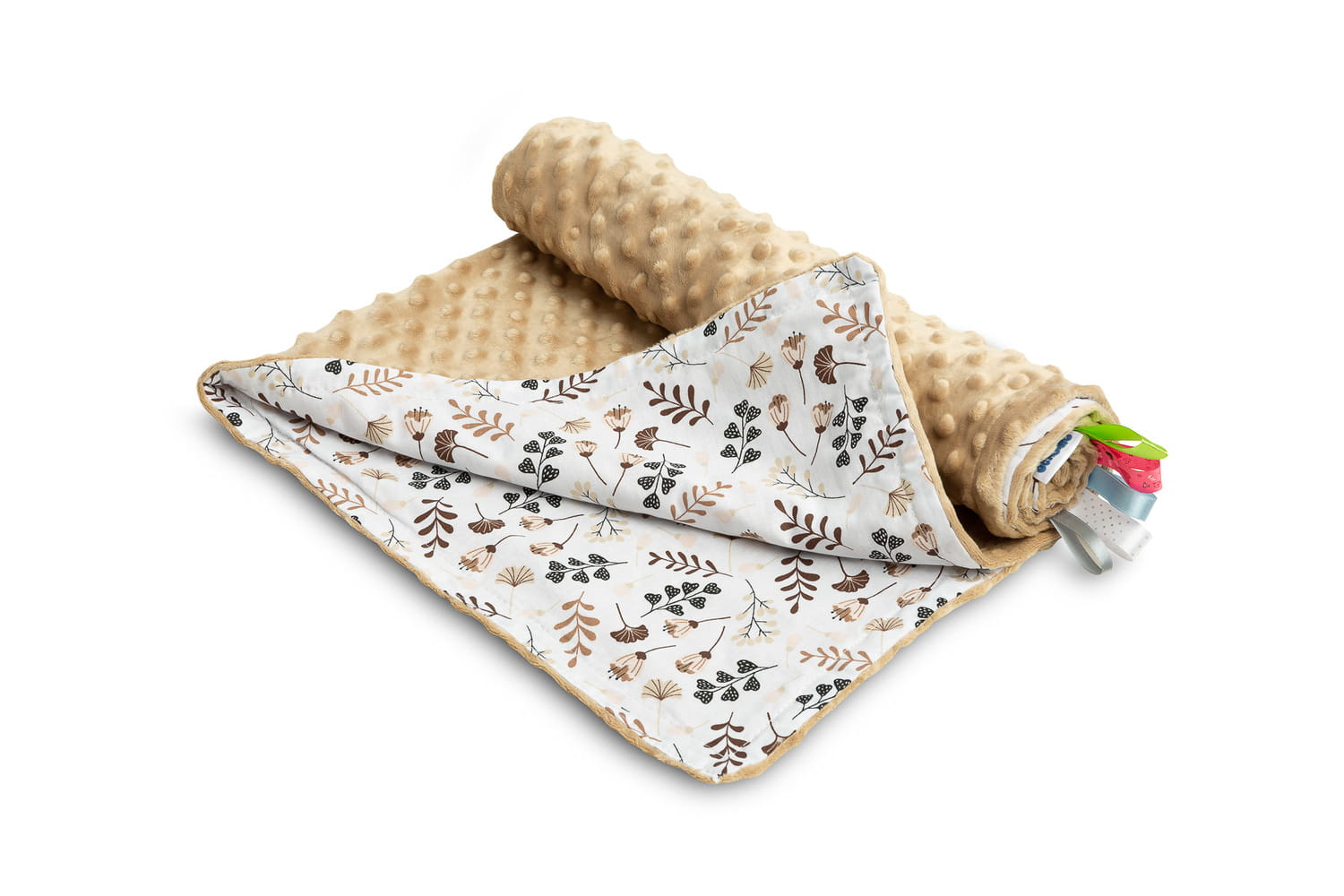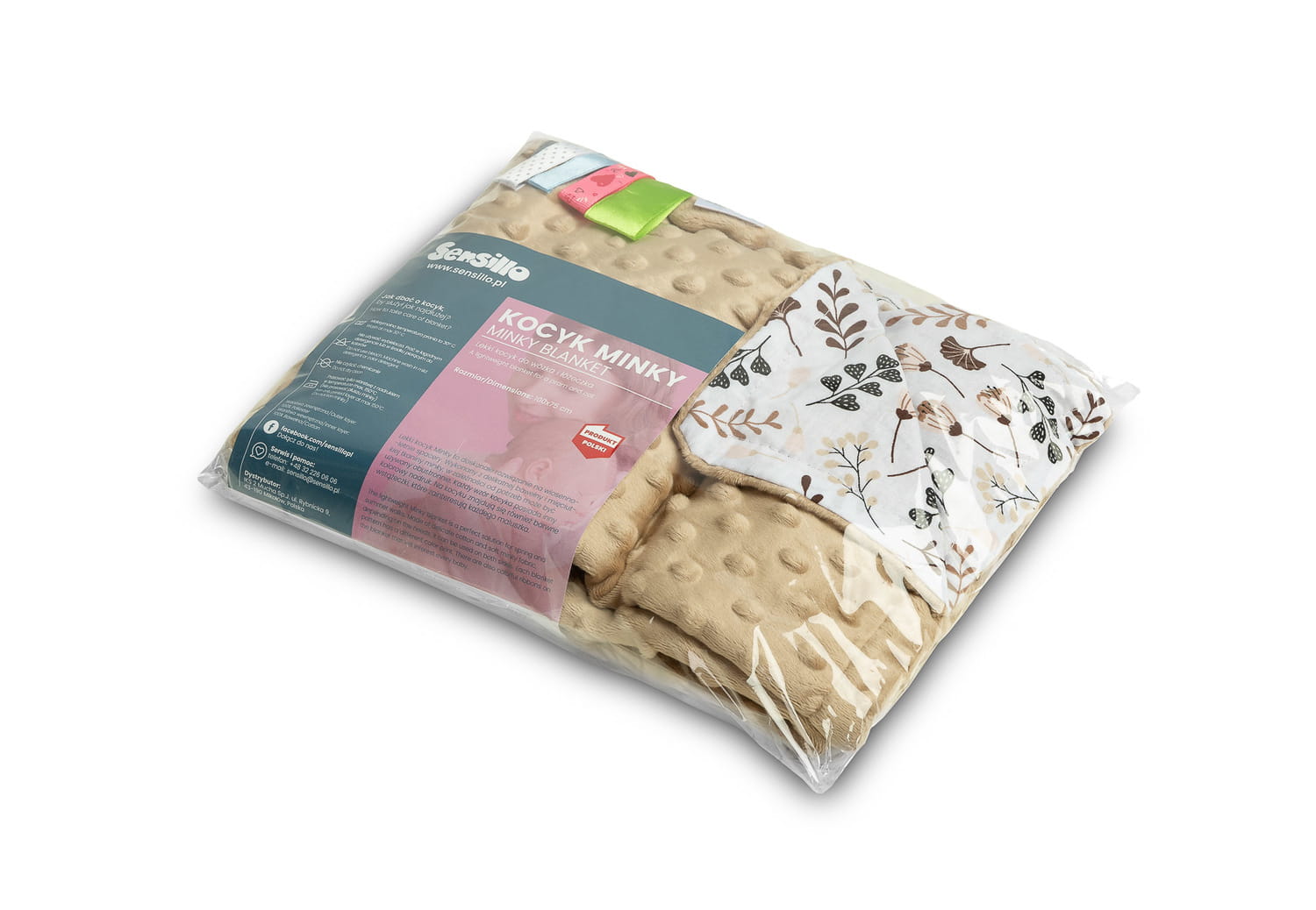 Lekki kocyk Minky wykonany z delikatnej bawełny i mięciutkiej tkaniny minky, w zależności od potrzeb może być używany obustronnie.