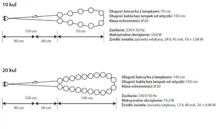 - Zawartość zestawu: 10 lub 20 kul, 2 sztuki zapasowych żarówek, kabel, pudełko z instrukcja montażu.