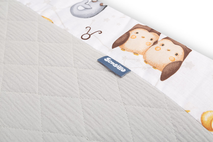 Ochraniacz wykonany jest z wysokiej jakości bawełny z nadrukiem oraz niezwykle miękkiego i przyjemnego w dotyku muślinu, dzięki czemu jest delikatny dla wrażliwej skóry dziecka. Wypełnienie z włókna poliestrowego amortyzuje uderzenia i chroni malucha przed kontaktem z twardymi szczebelkami łóżeczka podczas poruszania się.