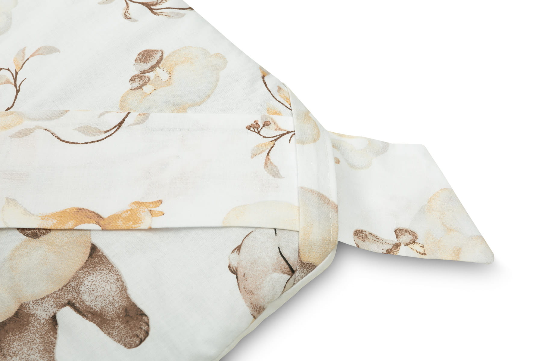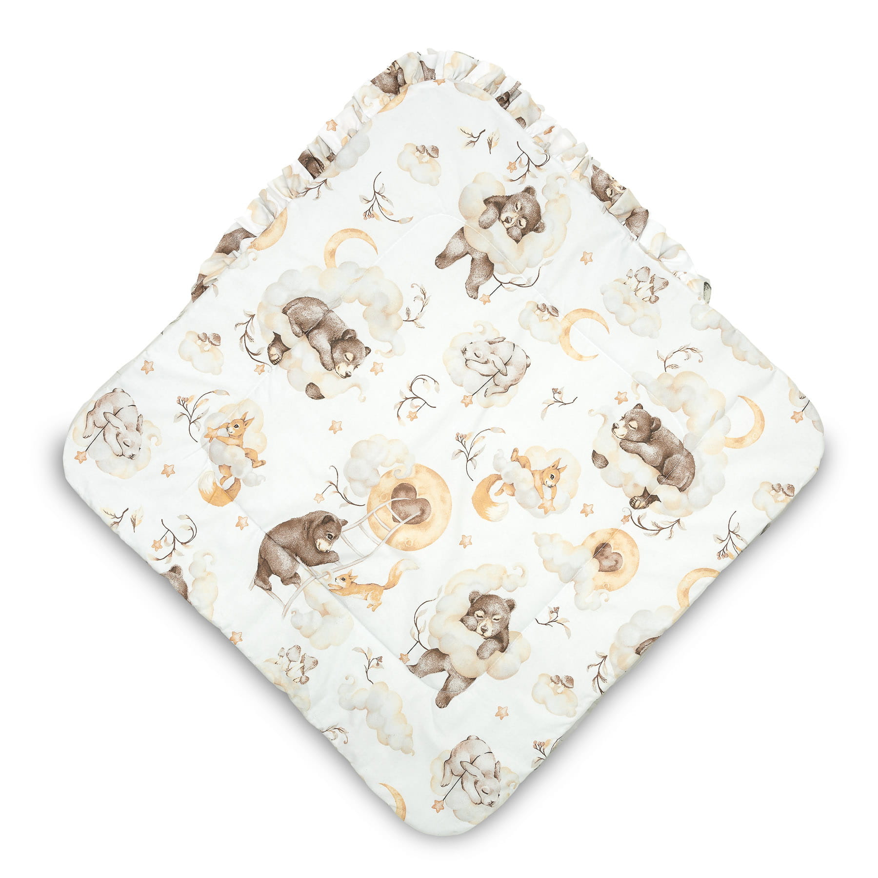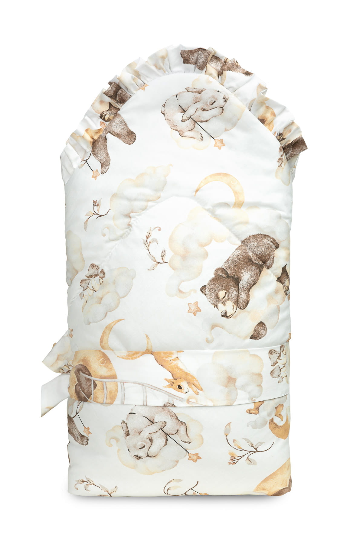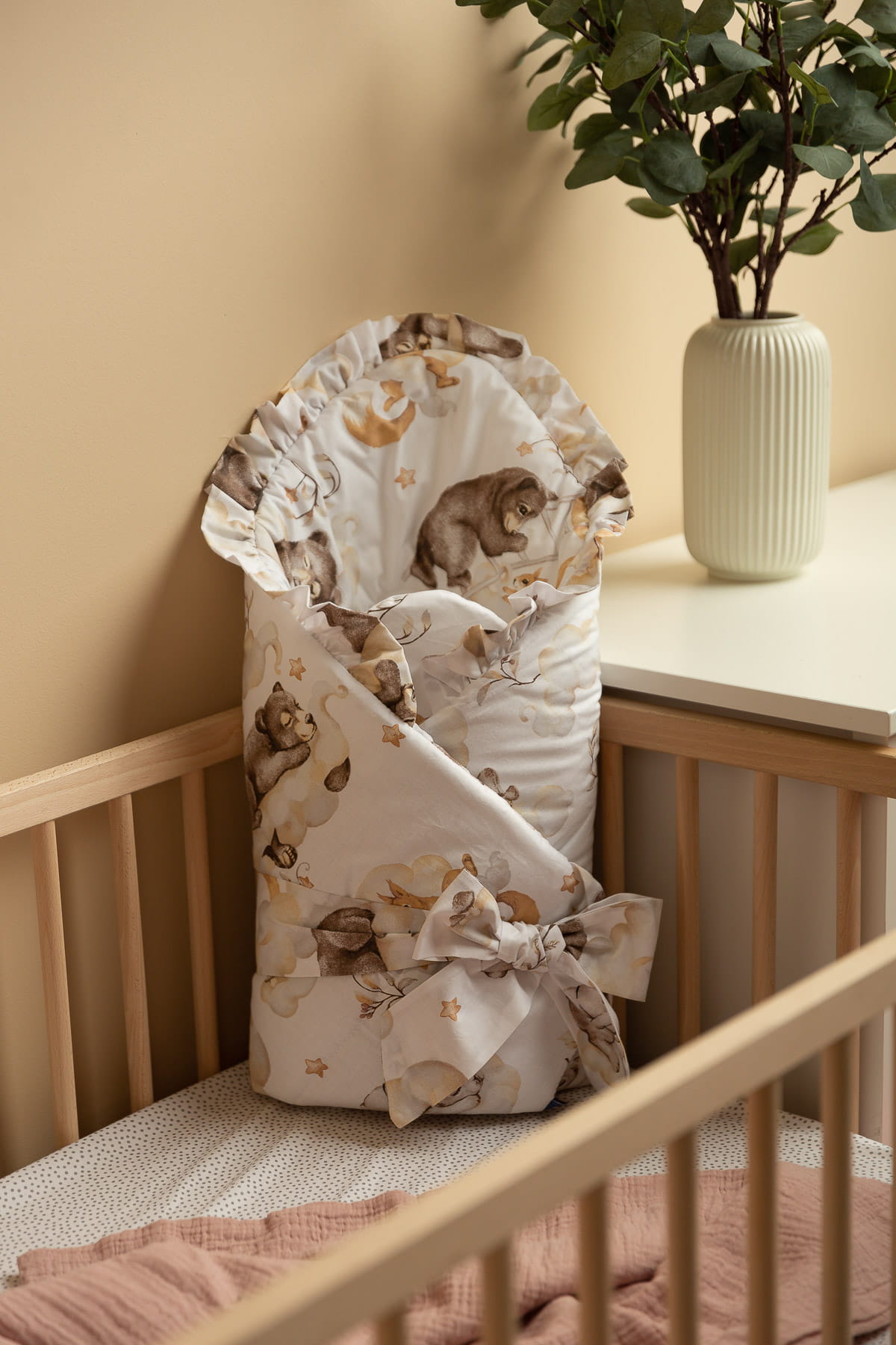 Dwustronny rożek niemowlęcy z falbanką został stworzony z myślą o noworodkach i niemowlętach. Wiązane zapięcie z szeroką bawełnianą tasiemką umożliwia wygodne trzymanie dziecka podczas karmienia i usypiania. Po rozłożeniu, rożek może być z powodzeniem stosowany jako kołderka do łóżeczka czy wózka dziecięcego. Może także służyć jako mata do zabawy. Wykonany został z bawełny 100%. Wypełnienie rożka to włóknina puszysta silikonowa. Wykończenie stanowi gustowna falbanka.