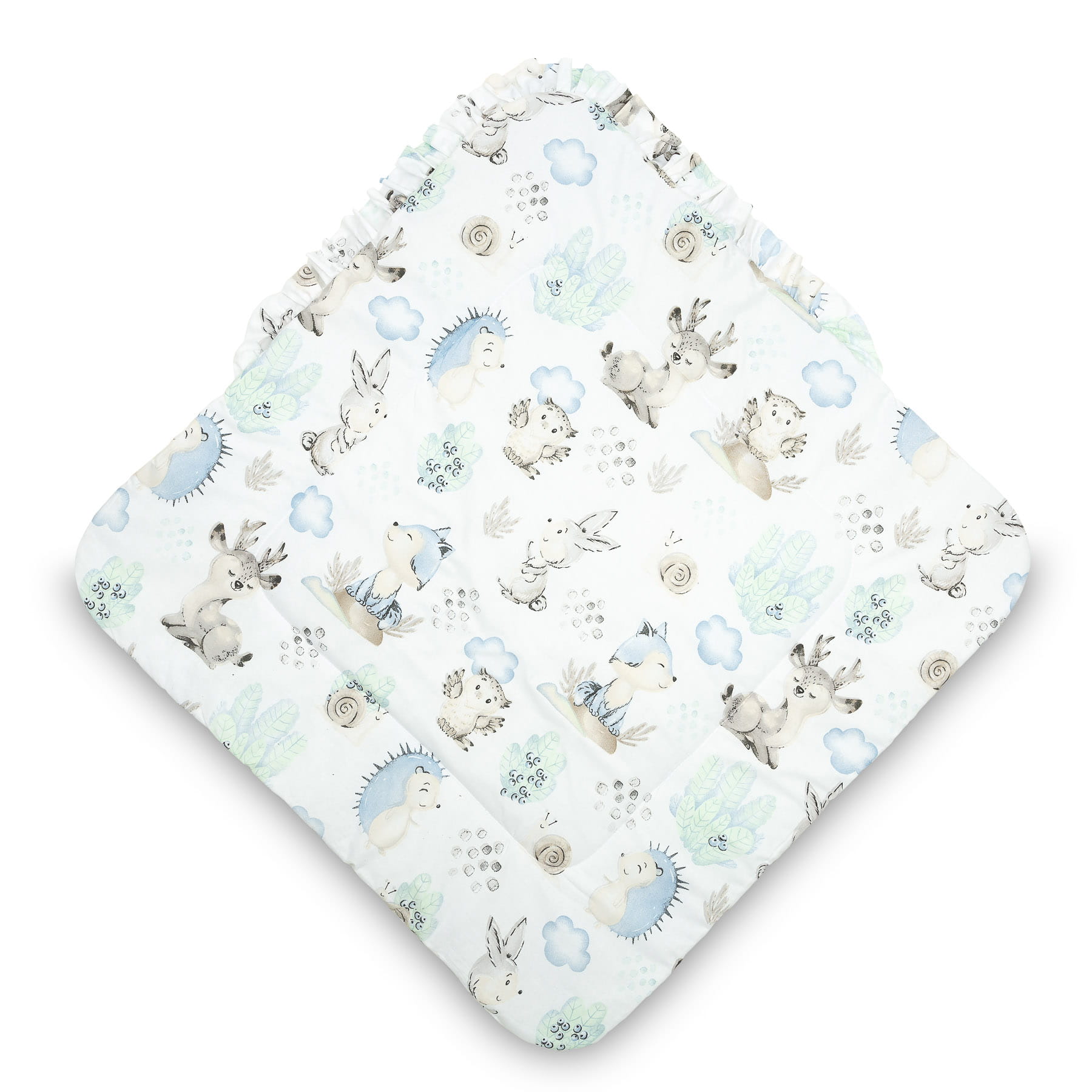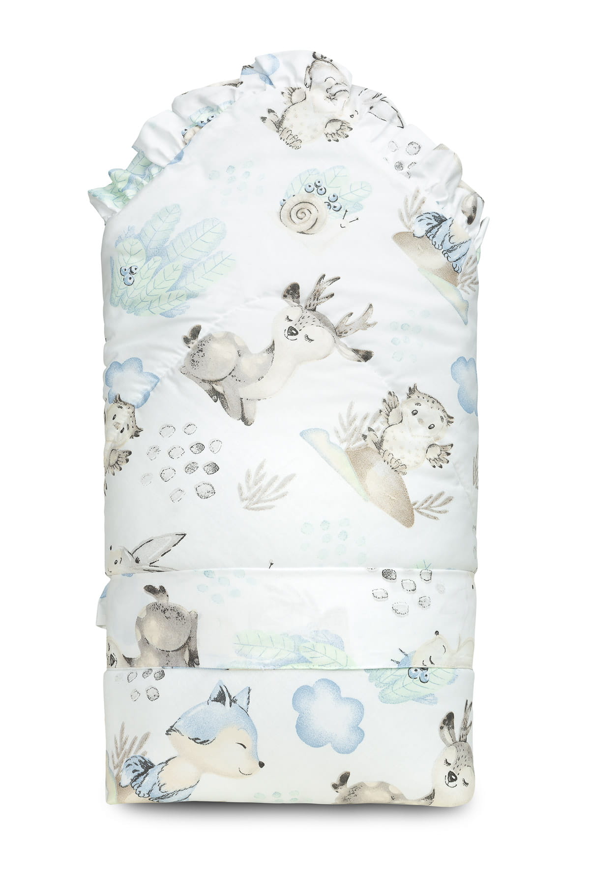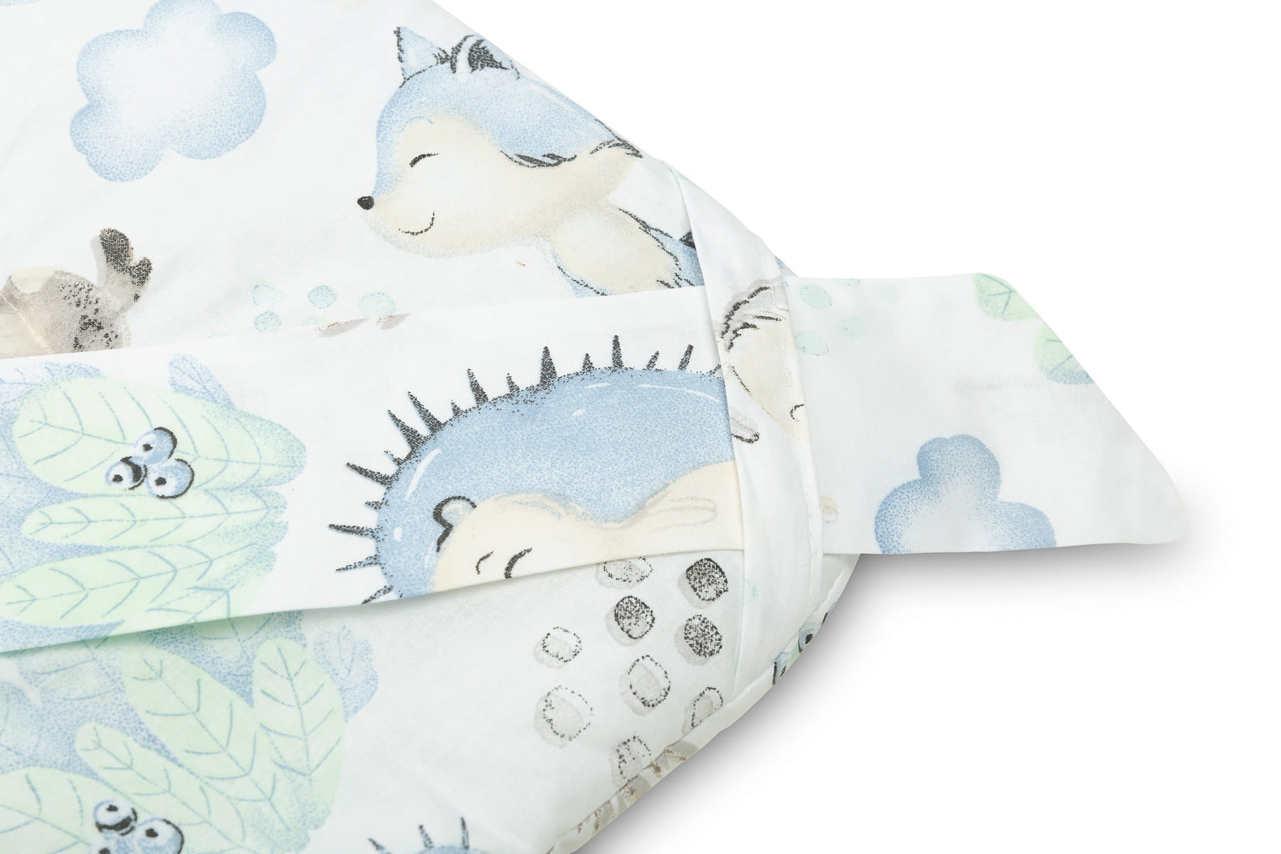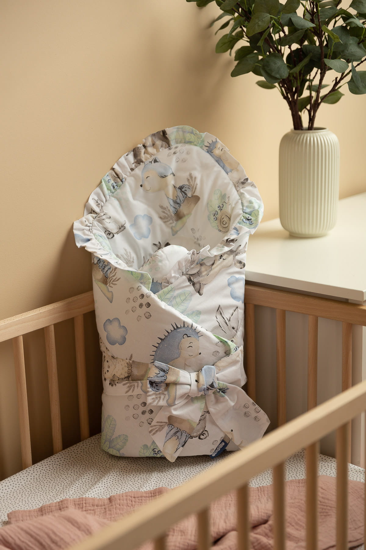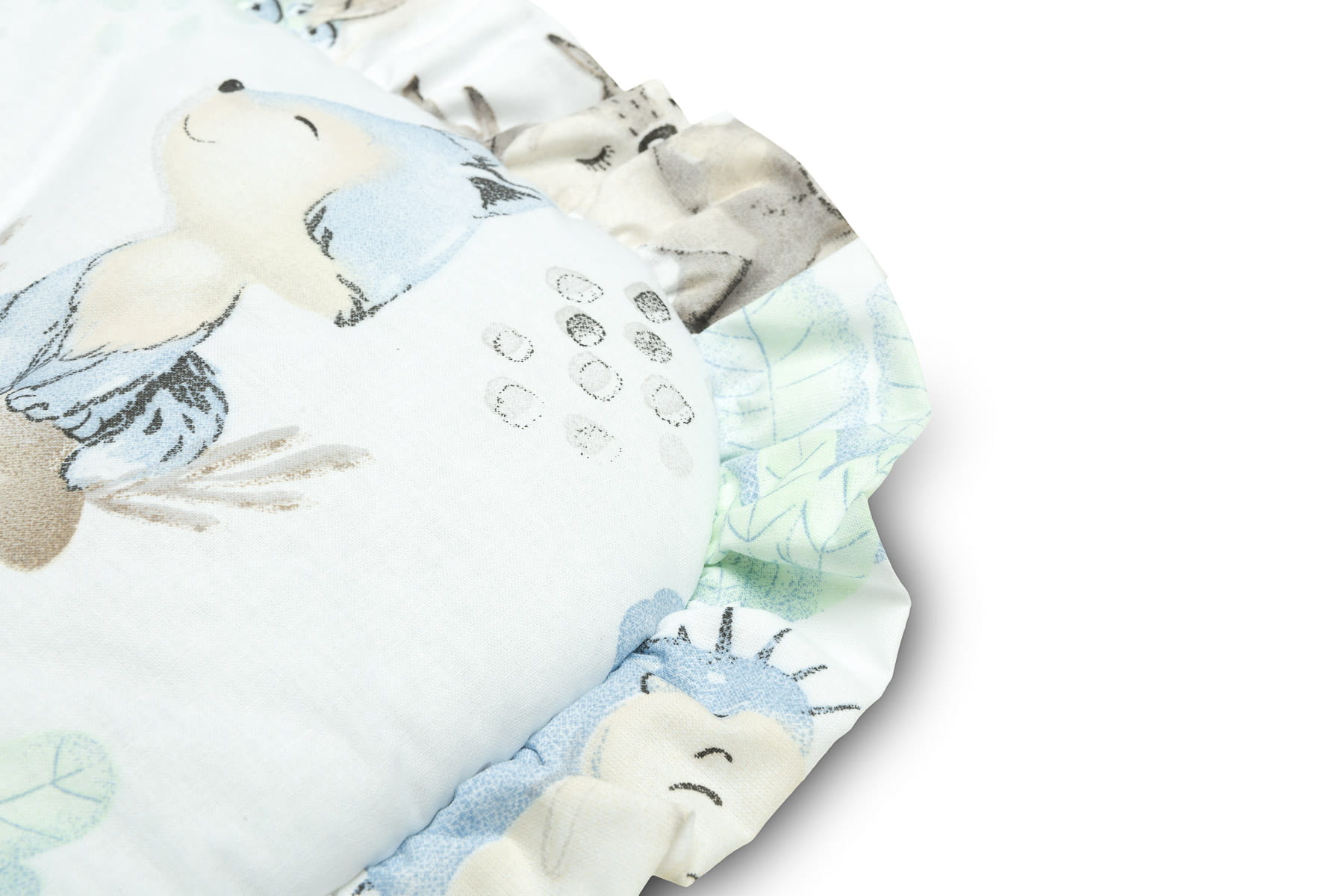 Dwustronny rożek niemowlęcy z falbanką został stworzony z myślą o noworodkach i niemowlętach. Wiązane zapięcie z szeroką bawełnianą tasiemką umożliwia wygodne trzymanie dziecka podczas karmienia i usypiania. Po rozłożeniu, rożek może być z powodzeniem stosowany jako kołderka do łóżeczka czy wózka dziecięcego. Może także służyć jako mata do zabawy. Wykonany został z bawełny 100%. Wypełnienie rożka to włóknina puszysta silikonowa. Wykończenie stanowi gustowna falbanka.