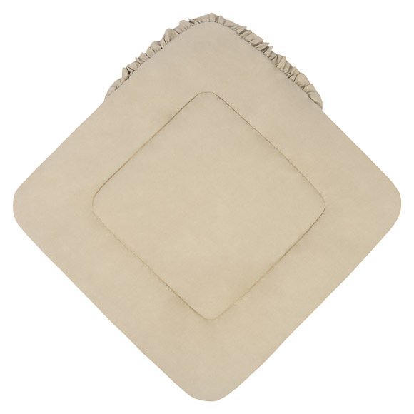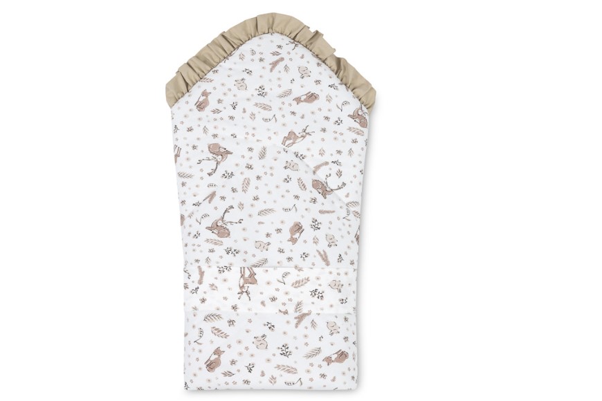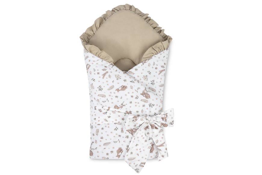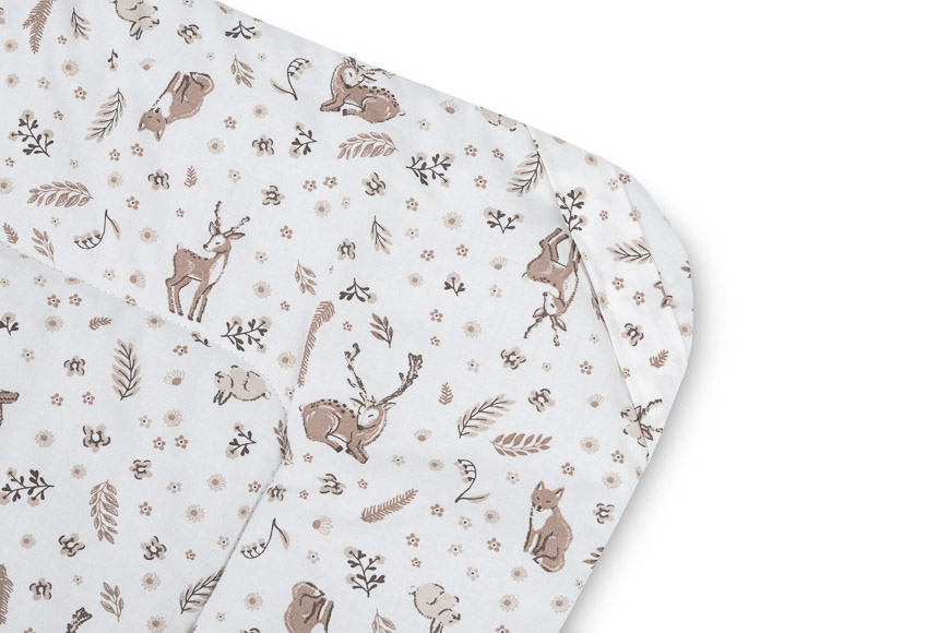 Dwustronna konstrukcja pozwala na zmianę wyglądu – jedna strona z subtelnym nadrukiem, druga z miękkiej bawełny. Rożek sprawdzi się jako otulacz do snu, mata do zabawy oraz wygodne wsparcie podczas karmienia i noszenia.