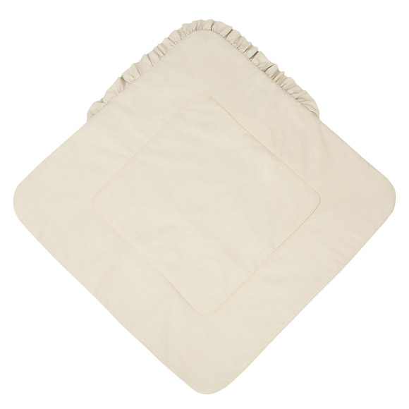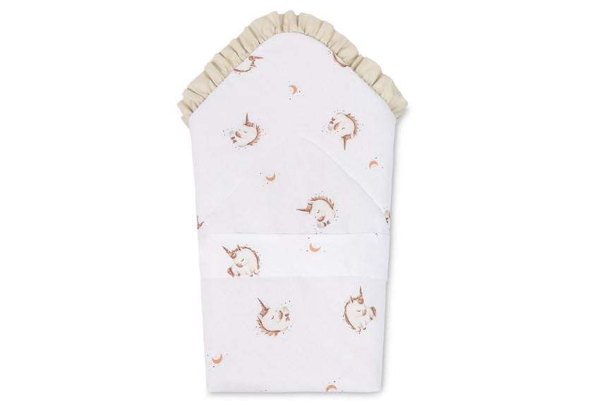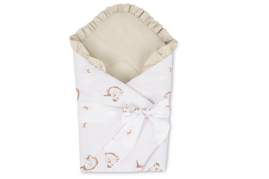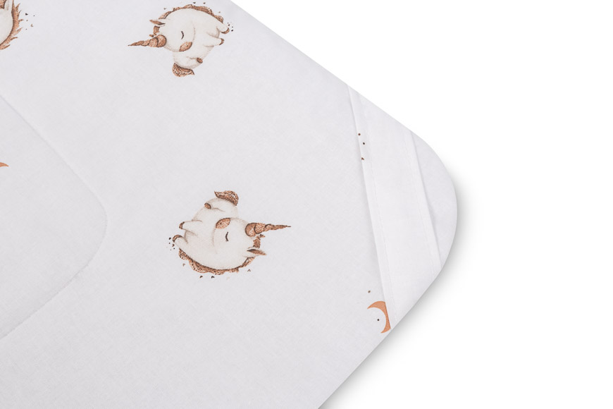 Dwustronna konstrukcja pozwala na zmianę wyglądu – jedna strona z subtelnym nadrukiem, druga z miękkiej bawełny. Rożek sprawdzi się jako otulacz do snu, mata do zabawy oraz wygodne wsparcie podczas karmienia i noszenia.