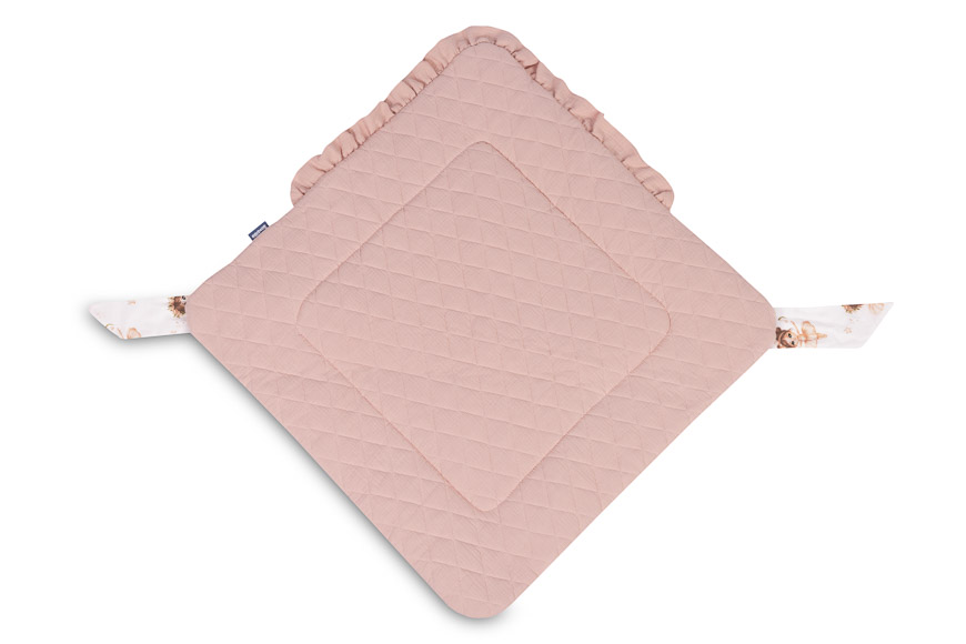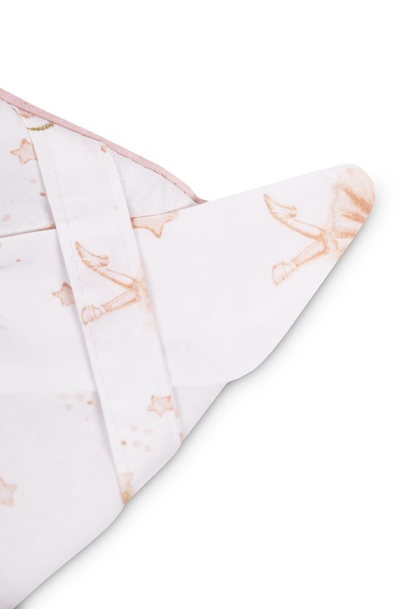 Jednostronny rożek niemowlęcy Muślin został stworzony z myślą o noworodkach i niemowlętach. Zapięcie na rzep umożliwia wygodne trzymanie dziecka podczas karmienia i usypiania. Po rozłożeniu, rożek może być z powodzeniem stosowany jako kołderka do łóżeczka czy wózka dziecięcego. Może także służyć jako mata do zabawy. Wykonany został z tkanin bawełnianych: bawełny drukowanej oraz muślinu. Wypełnienie rożka to antyalergiczna włóknina puszysta silikonowa. Wysoką jakość wykonania podkreśla estetyczna wypustka