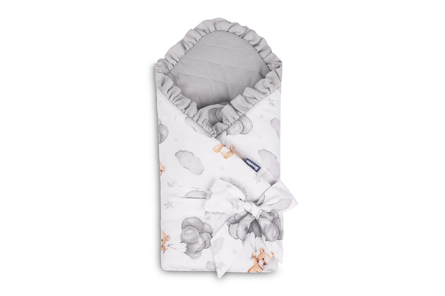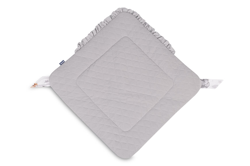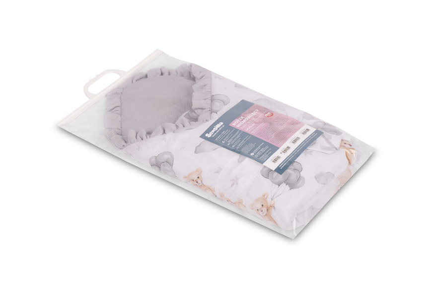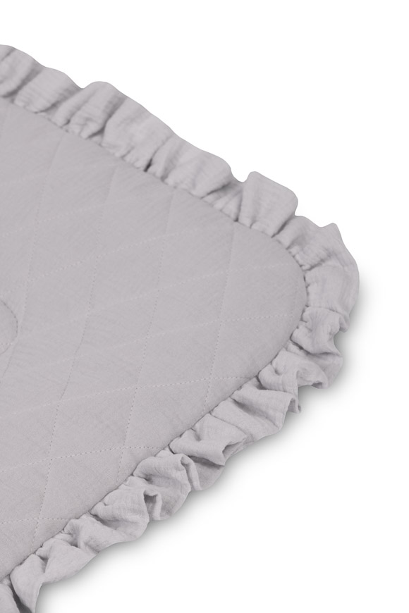 Jednostronny rożek niemowlęcy Muślin został stworzony z myślą o noworodkach i niemowlętach. Zapięcie na rzep umożliwia wygodne trzymanie dziecka podczas karmienia i usypiania. Po rozłożeniu, rożek może być z powodzeniem stosowany jako kołderka do łóżeczka czy wózka dziecięcego. Może także służyć jako mata do zabawy. Wykonany został z tkanin bawełnianych: bawełny drukowanej oraz muślinu. Wypełnienie rożka to antyalergiczna włóknina puszysta silikonowa. Wysoką jakość wykonania podkreśla estetyczna wypustka