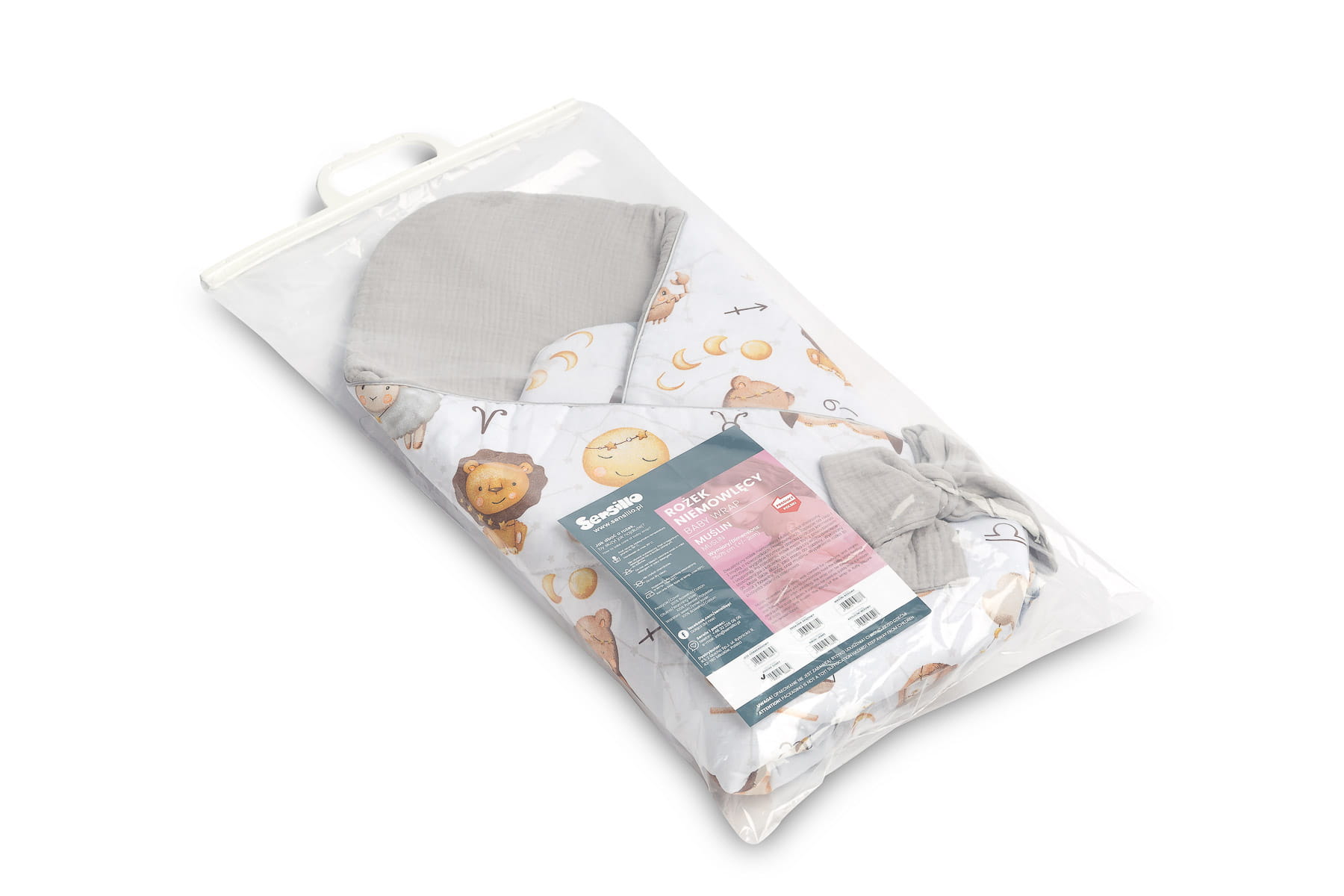 Jednostronny rożek niemowlęcy Muślin został stworzony z myślą o noworodkach i niemowlętach. Zapięcie na rzep umożliwia wygodne trzymanie dziecka podczas karmienia i usypiania. Po rozłożeniu, rożek może być z powodzeniem stosowany jako kołderka do łóżeczka czy wózka dziecięcego. Może także służyć jako mata do zabawy. Wykonany został z tkanin bawełnianych: bawełny drukowanej oraz muślinu. Wypełnienie rożka to antyalergiczna włóknina puszysta silikonowa. Wysoką jakość wykonania podkreśla estetyczna wypustka
